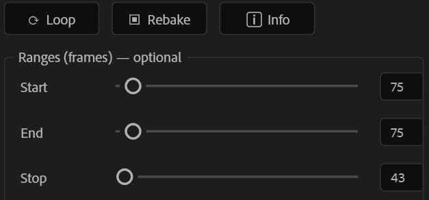 LOOP_STOP(orNEW_START), quickly re-bake the exit keyframe. - Auto-prefill: detects selected keys to prefill Start/End and uses the playhead for Stop.